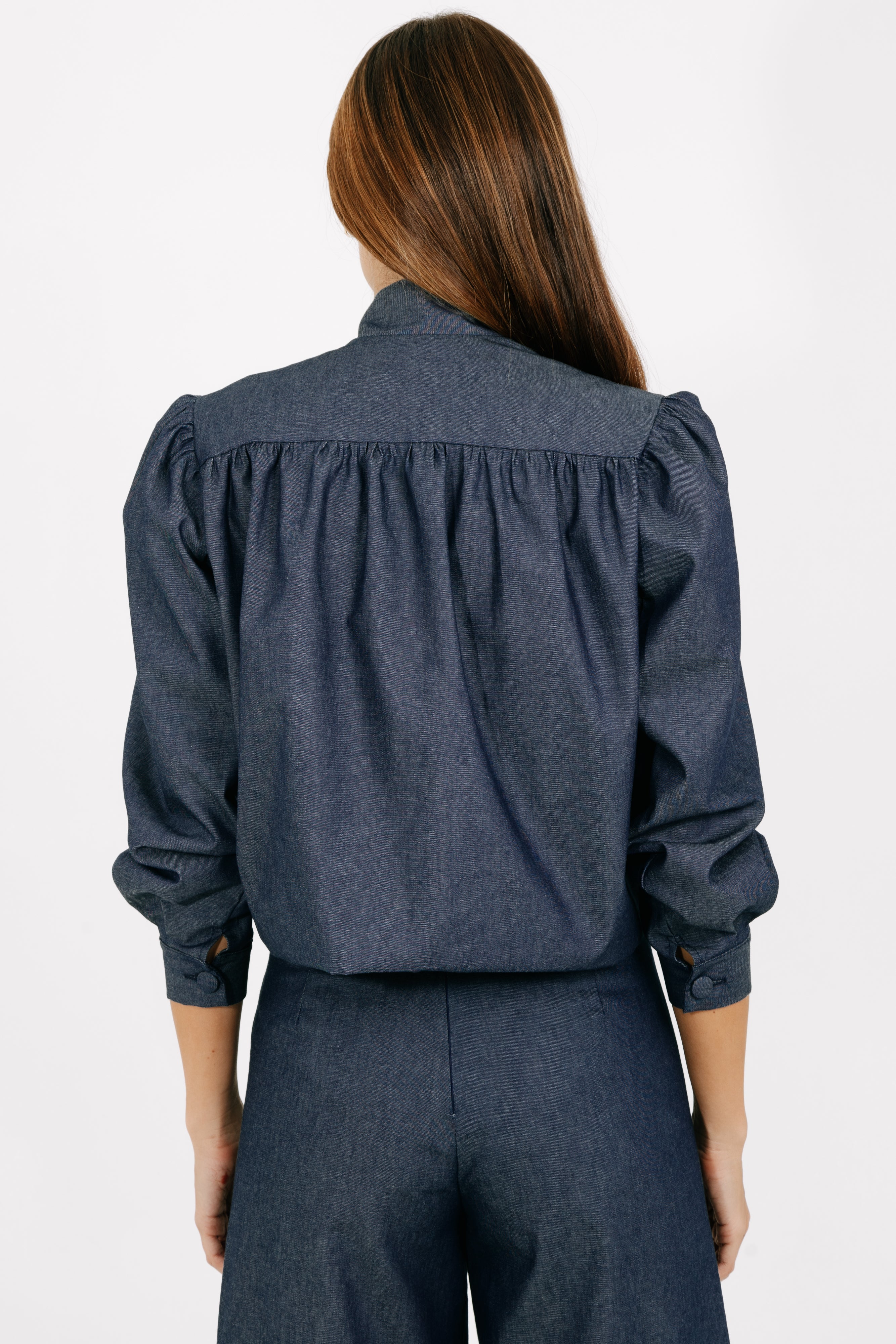 Crafted from a soft cotton–denim blend, the jacket is fully lined with striped cotton shirting for added comfort and a smooth interior finish. Covered buttons made from the same denim fabric create a cohesive, understated look, while subtle seam detailing adds quiet dimension.