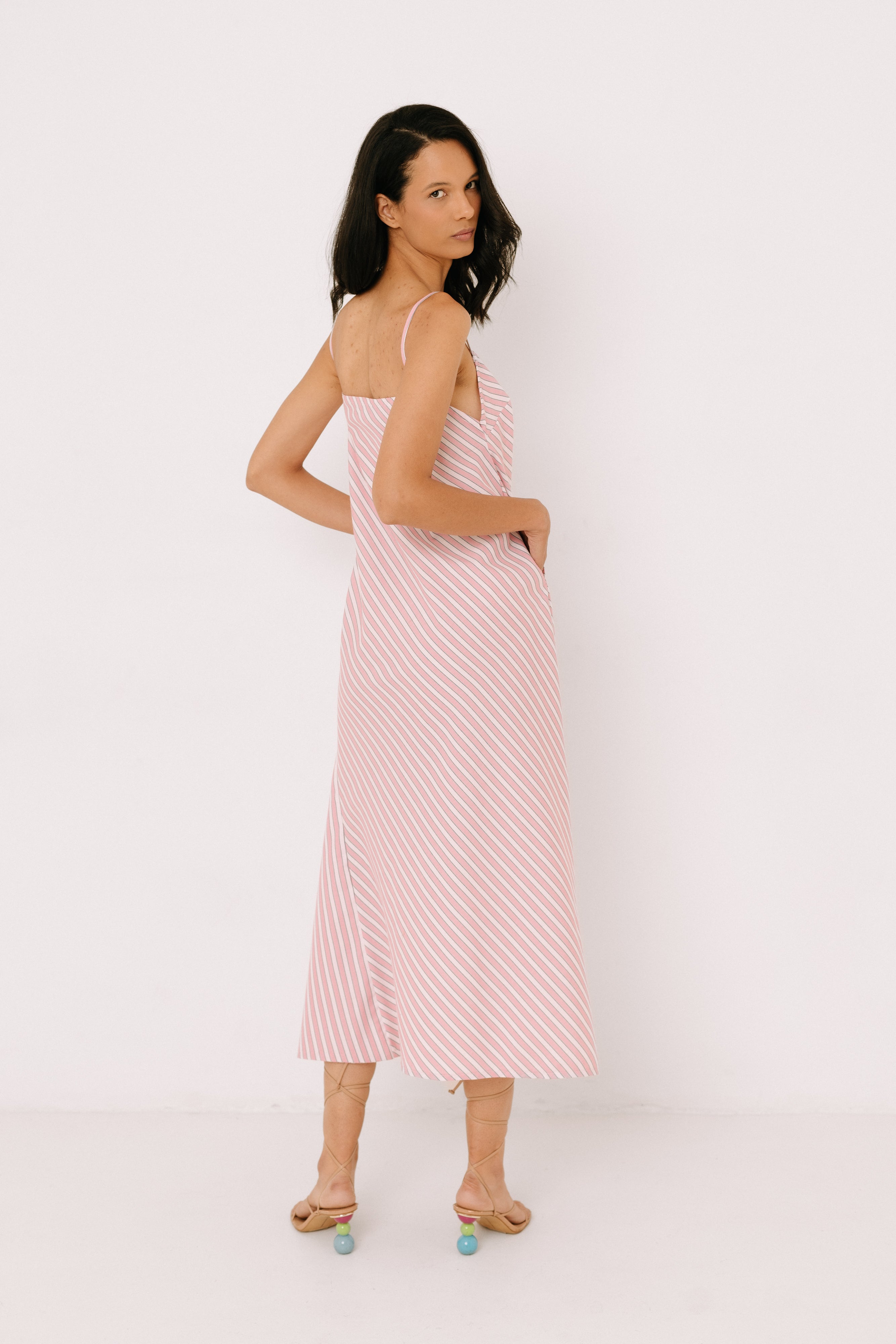 Striped slip dress with asymmetrical drape and soft movement. Its elongated silhouette and fluid fabric create a relaxed yet refined presence, perfect for summer evenings.