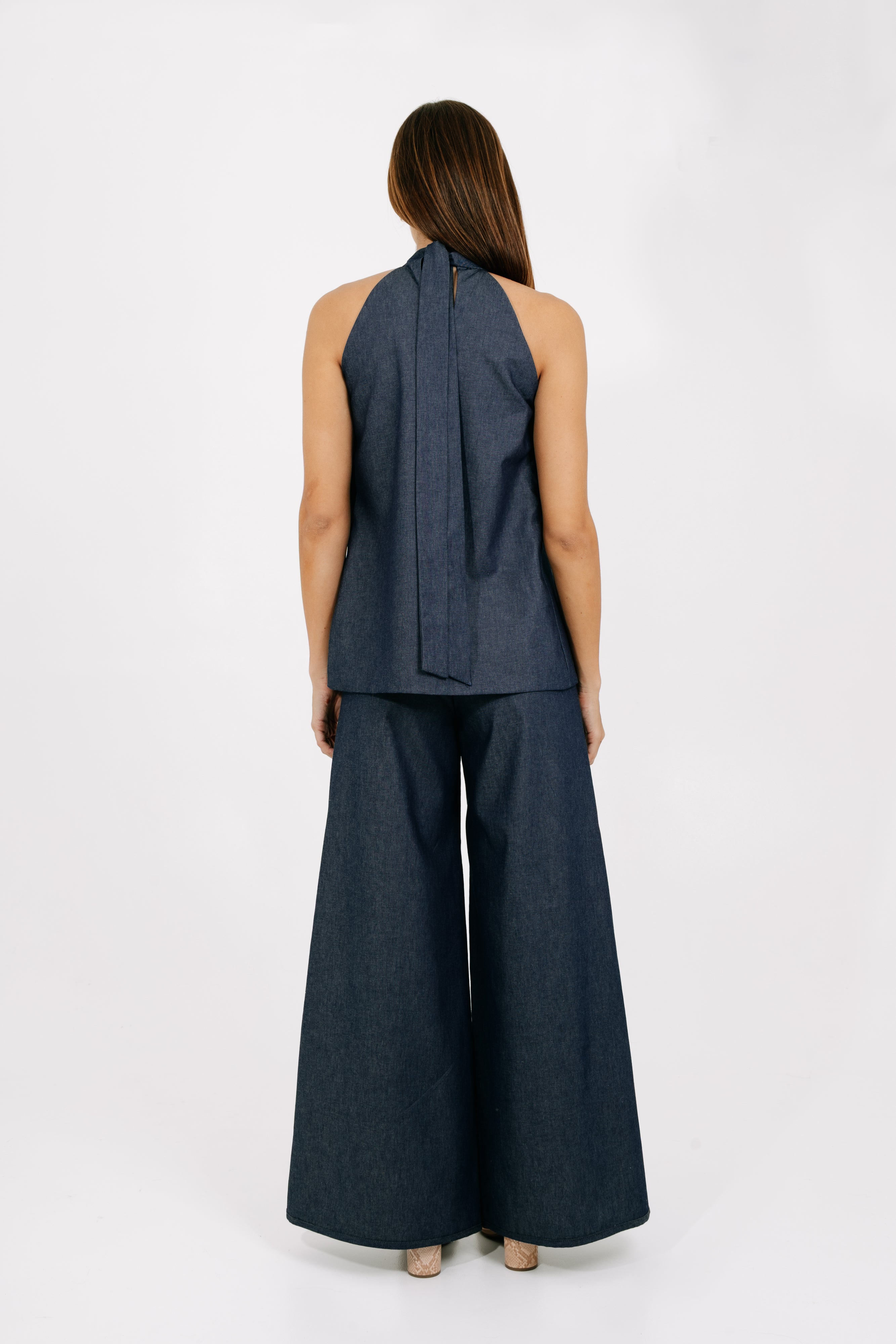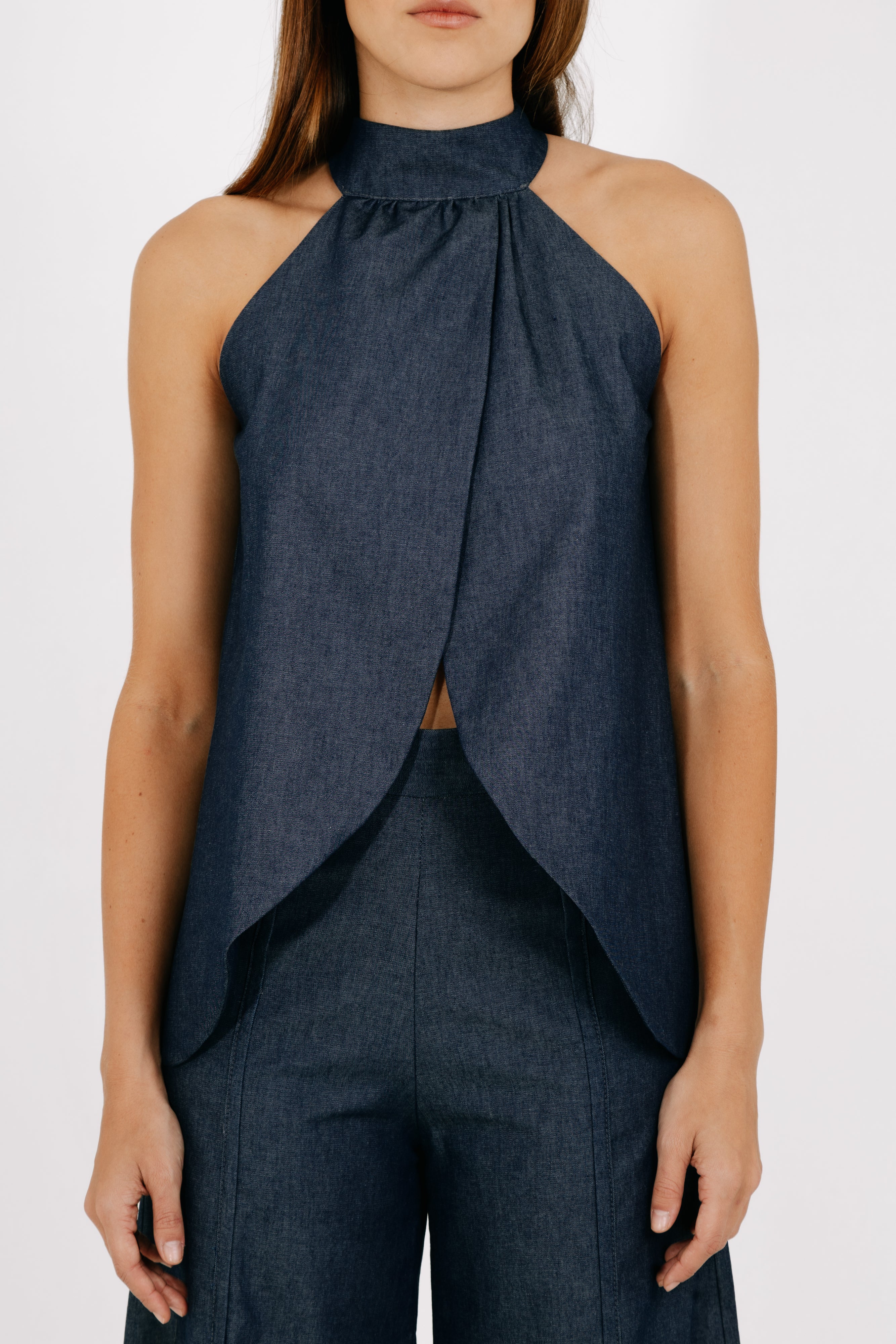 This halter top features a clean, elongated silhouette with soft structure and fluid movement. Designed in a cotton–denim blend, it showcases a refined wrap-front detail that creates subtle dimension while maintaining a polished, minimal look.