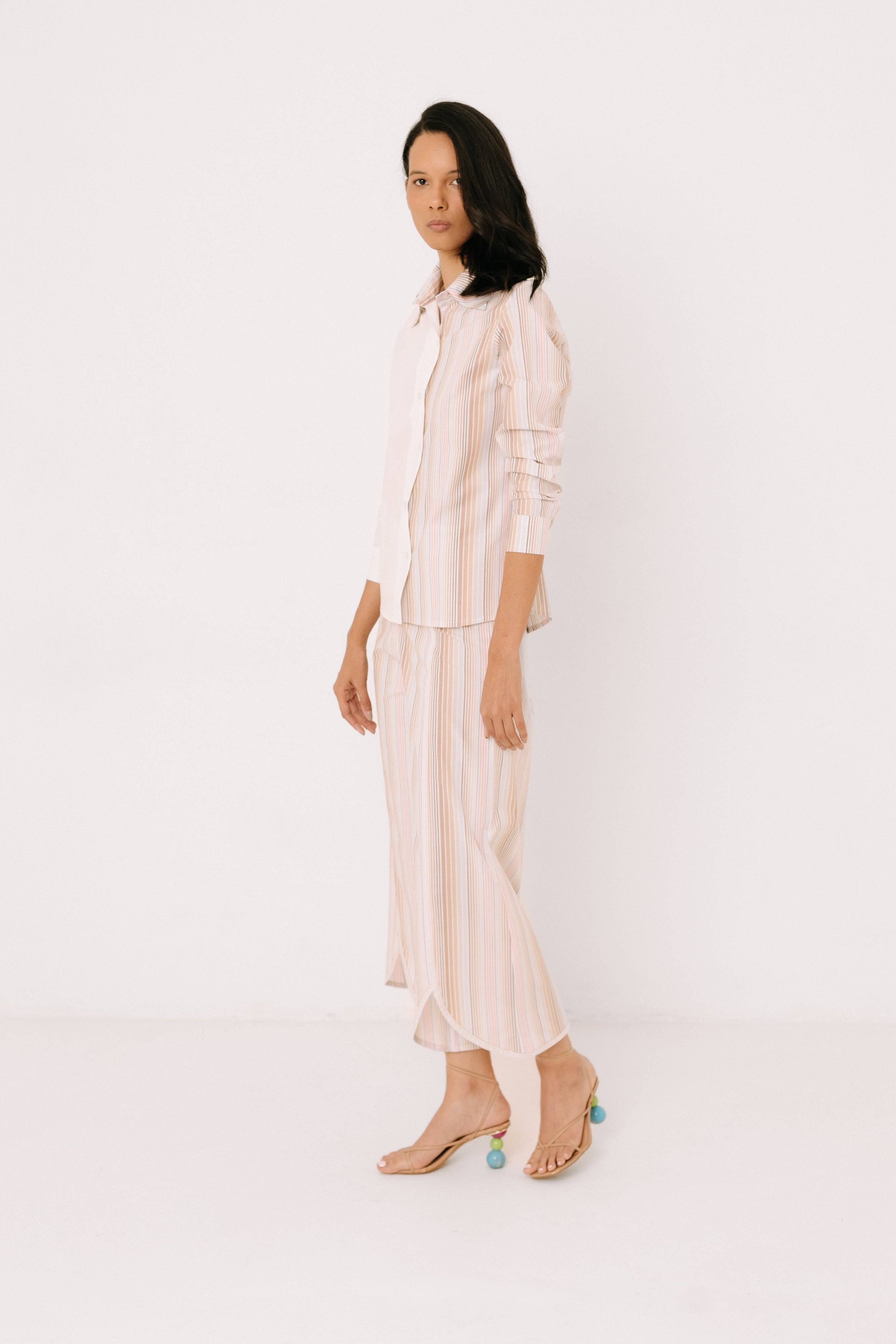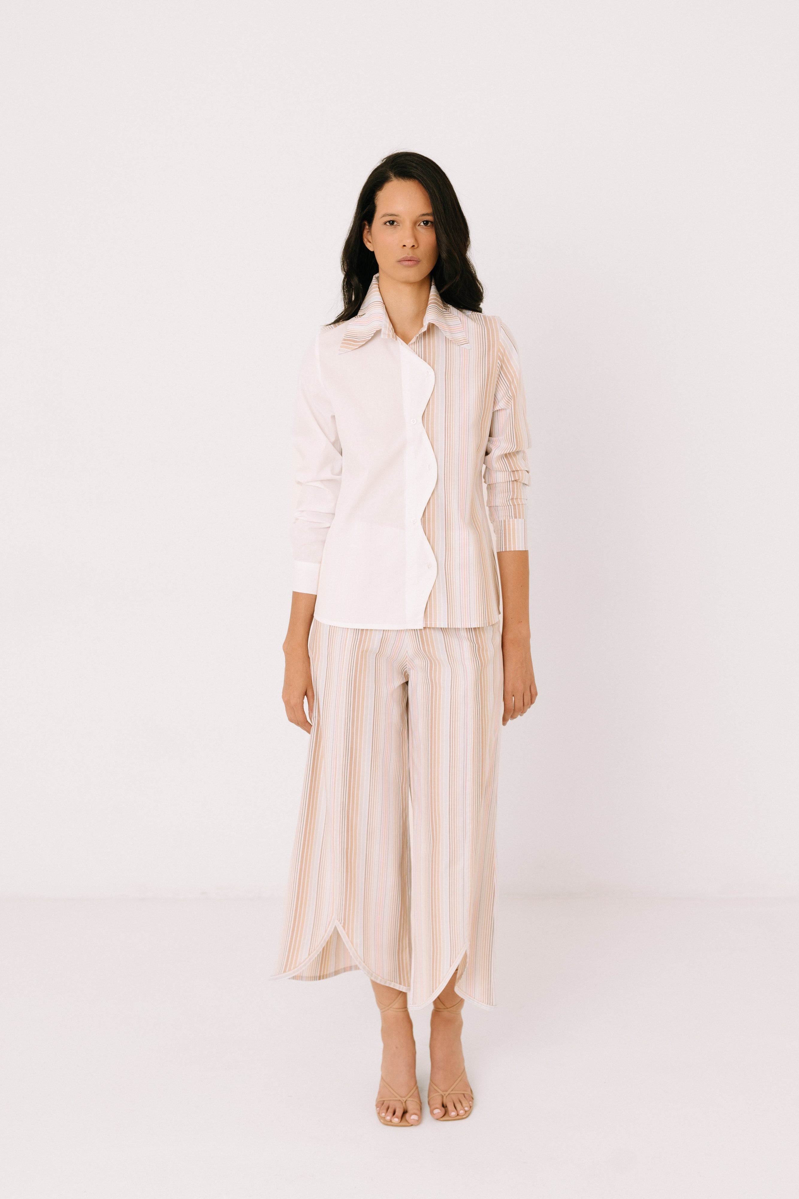 Contrast-block button-down shirt with signature wavy placket detail. A redefined classic that blends crisp tailoring with soft movement, perfect for day-to-evening versatility.